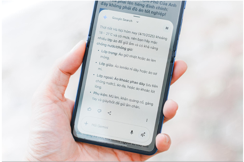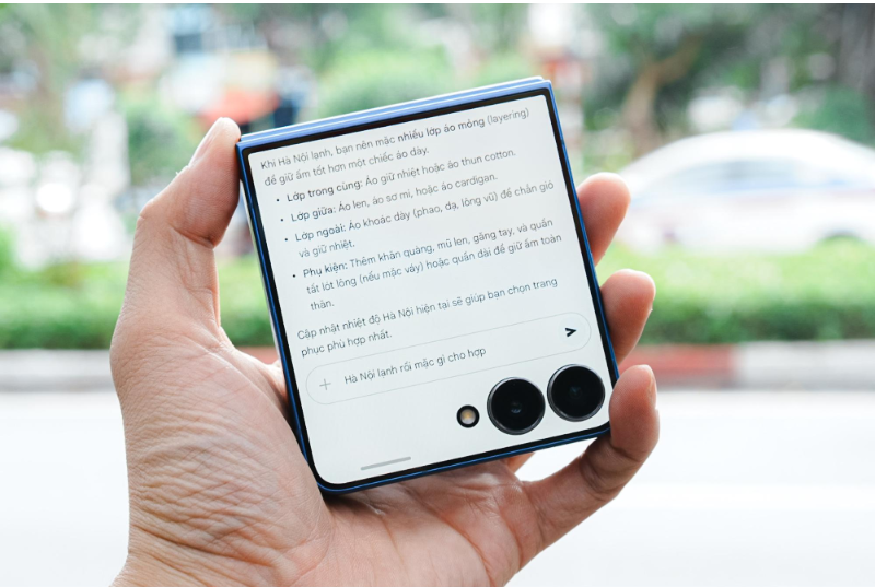 Một trong những khác biệt lớn nhất giữa Z Flip7 và các dòng smartphone khác nằm ở hành động gập máy. Khi đóng lại, thiết bị gần như “biến mất” khỏi tầm nhìn, giúp người dùng tạm tách khỏi thế giới số mà không bỏ lỡ những việc quan trọng. Gemini vẫn hoạt động ở chế độ nền: tổng hợp nội dung, nhắc lịch họp, gợi ý nghỉ ngơi hay soạn sẵn báo cáo ngắn. Trong môi trường làm việc liên tục kết nối, sự hiện diện của AI theo cách âm thầm này giúp người dùng duy trì trạng thái tập trung và cân bằng hơn.